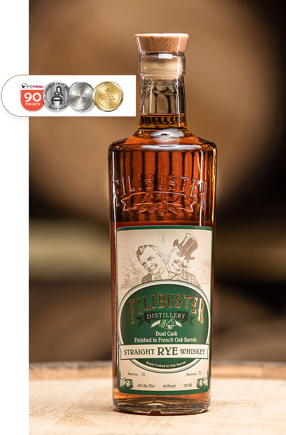 Filibuster Dual Cask Straight Rye Whiskey is a refined American rye finished in French Oak barrels, a rare secondary aging process that infuses subtle white-wine aromatics, creamy texture, and elegant depth into the spirit.